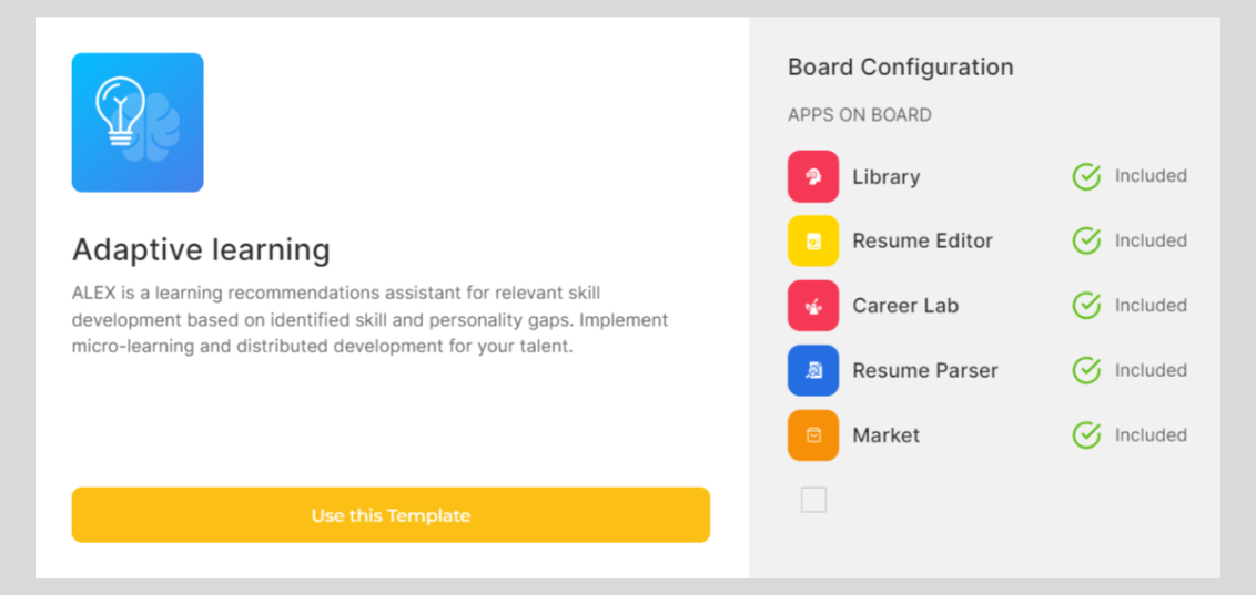 Getboarded's Adaptive Learning Template with ALEX offers a personalized and responsive learning environment. By integrating the included apps, you can implement adaptive learning strategies, foster skill development, and empower your talent to thrive in their professional journey. Explore the possibilities, customize your boards, and embark on a journey of continuous improvement.