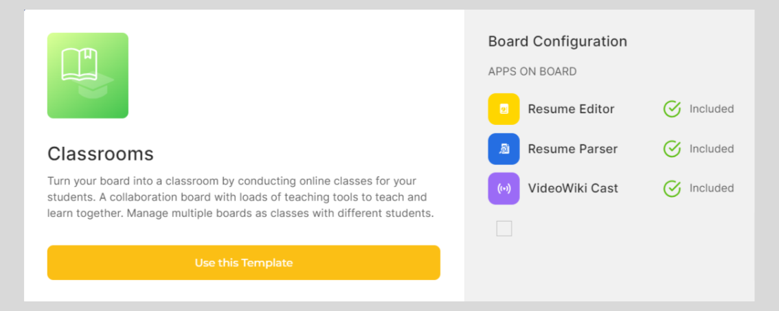 *Getboarded's Classrooms Template is a versatile platform for educators and trainers to conduct online classes with ease. By combining the included apps, you can create a collaborative and interactive learning environment for your students. Explore the features, customize your boards, and elevate your online teaching experience.*